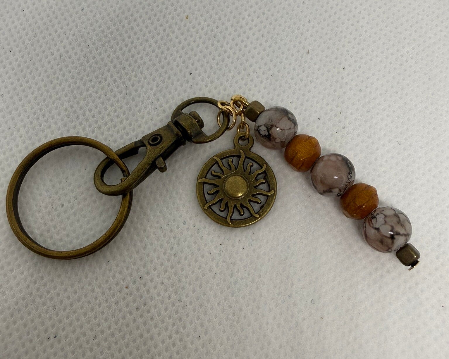 Keychain - Antique, grey Czech glass beads, wood beads, sun charm
