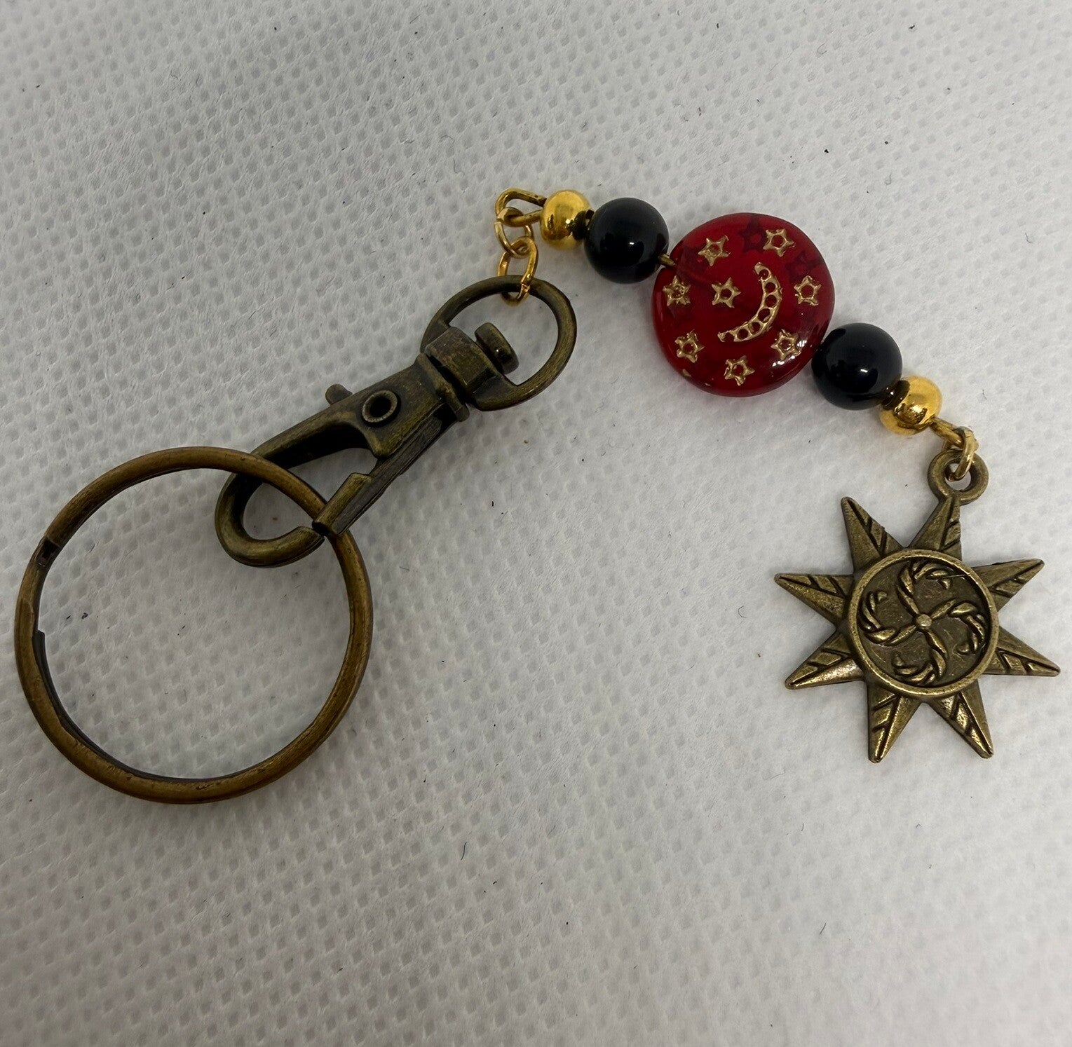 Keychain - Antique, Onyz, Red Czech bead with stars, Antique Star Charm