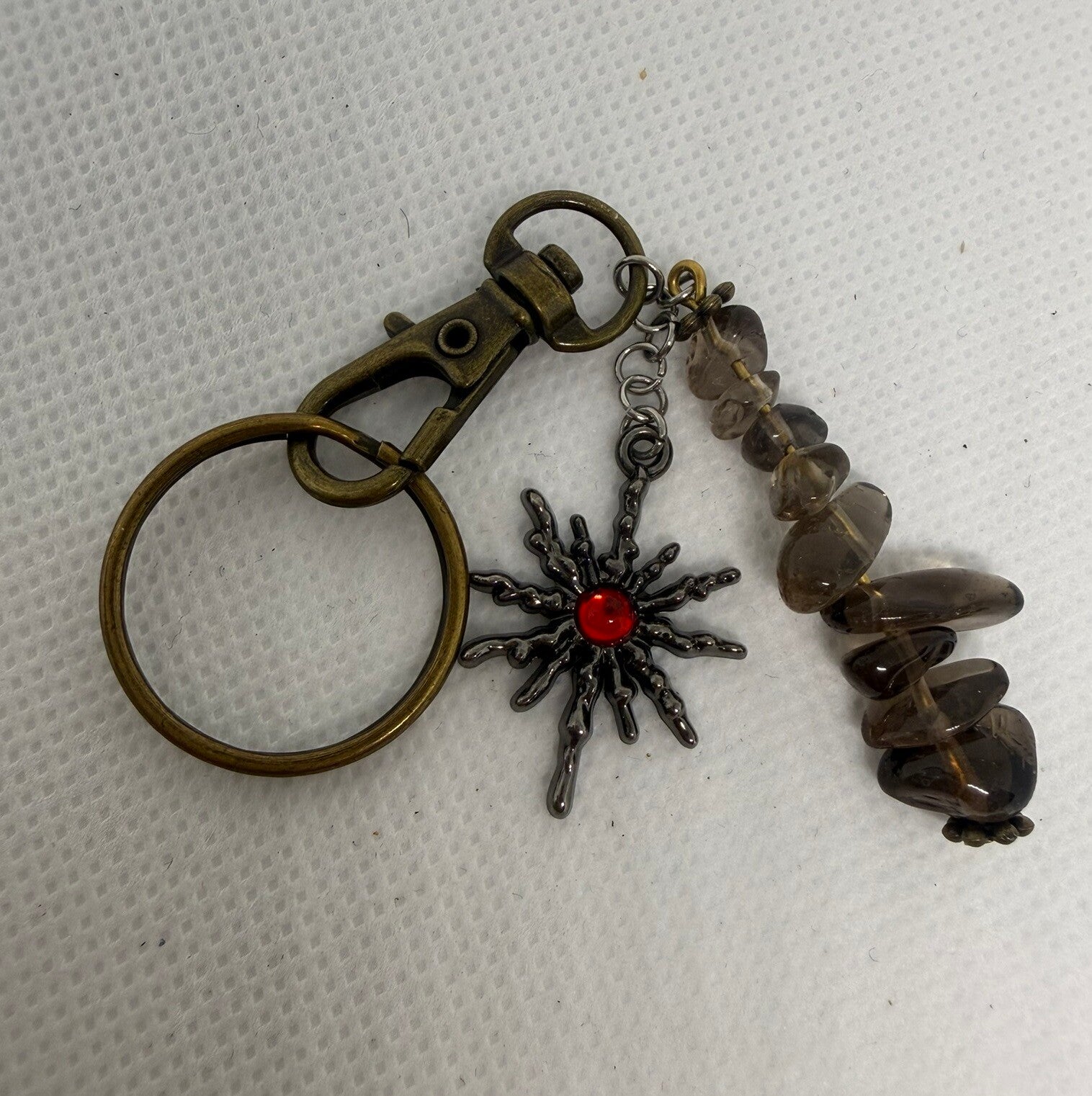 Keychain - Antique, Smoky Quartz Chips, Gothic Sunburst Charm with Red Bead