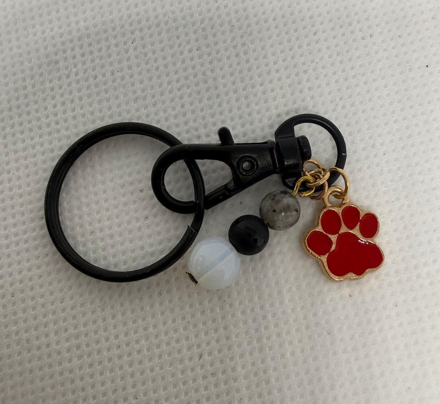 Keychain - Snowflake Obsidian, Onyx, White Czech Bead, Red Paw Charm