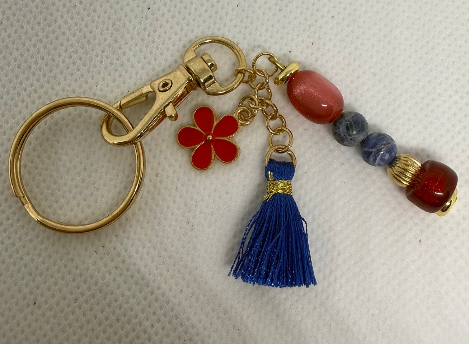 Keychain - Gold, Sodalite, Red Czech Glass Beads, Red Enamel Flower Charm, Blue Tassel
