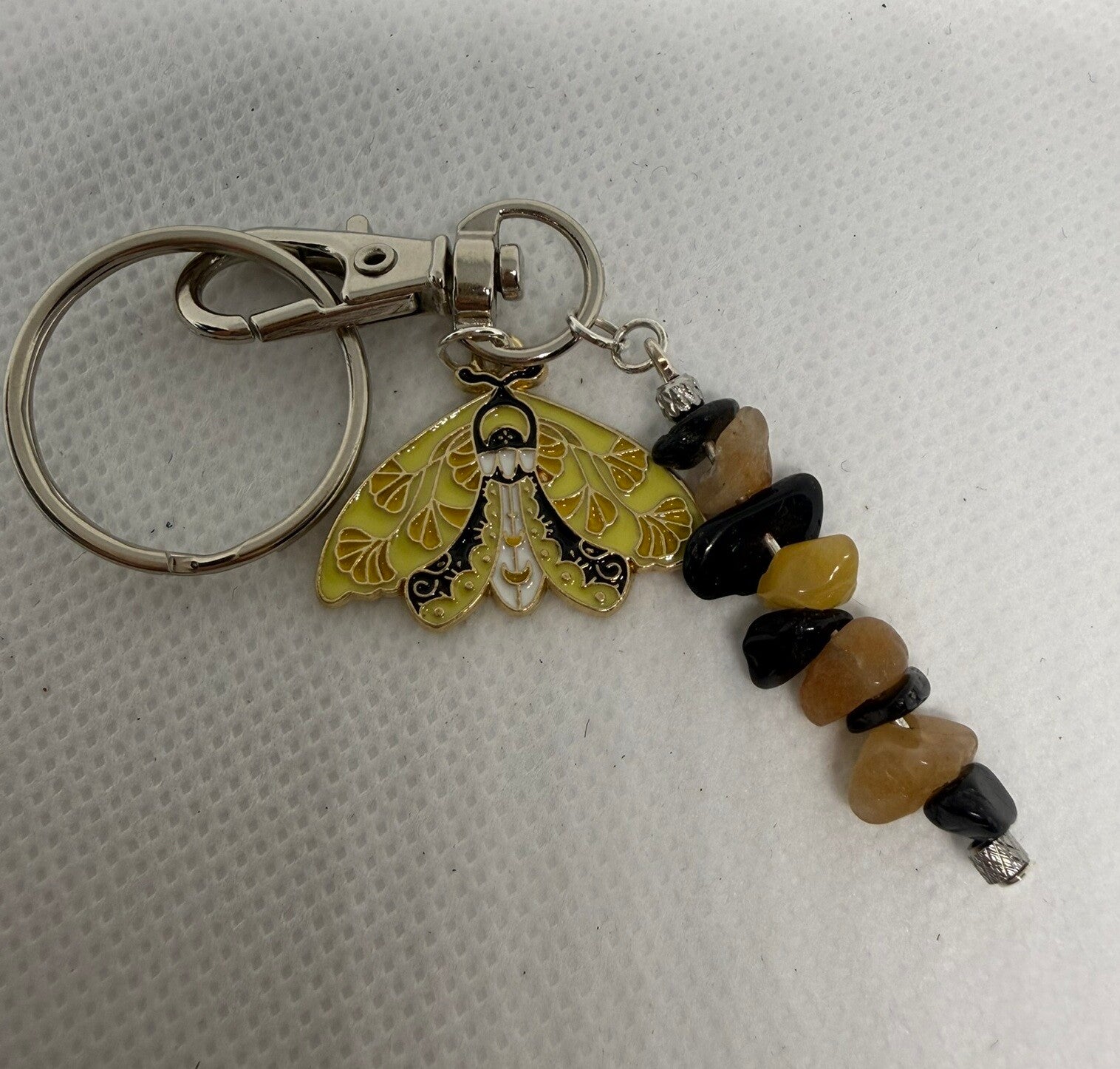 Keychain - Silver, Black Tourmaline and Peach Moonstone Chips, Yellow and Black Enamel Feather Butterfly Charm